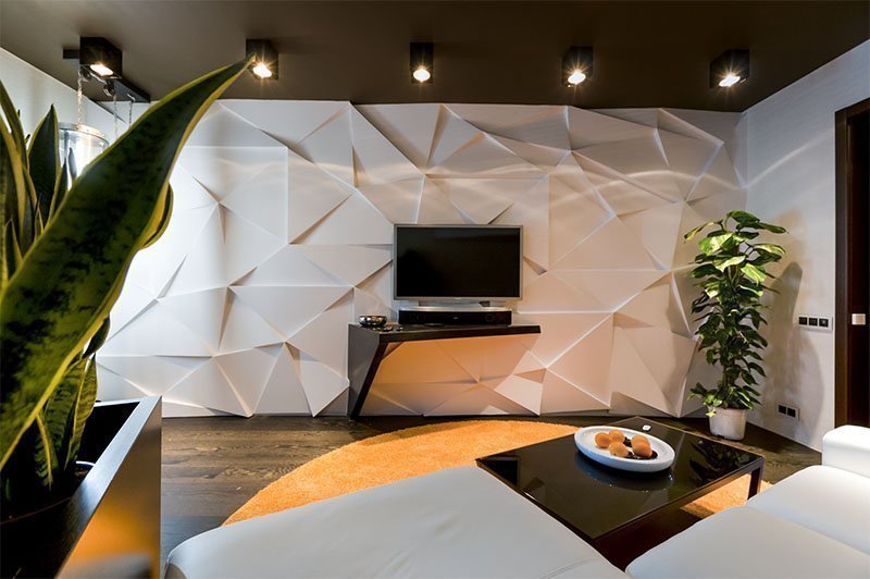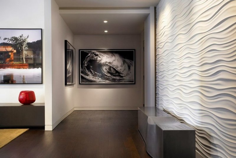 На стене, обшитой гладким гипсокартоном, легко создать любой рельеф применяя гипсовую или декоративную штукатурку. Некоторые производители предлагают объемные гипсовые 3D панели с необычайным рельефным оформлением. Правда такую новинку иногда сложно отыскать в свободной продаже, в некоторых случаях панели изготавливают по индивидуальному заказу.