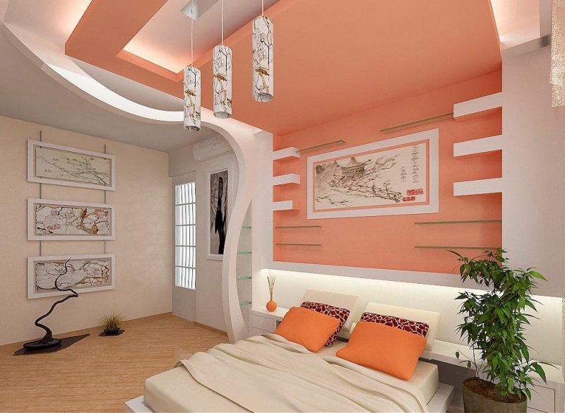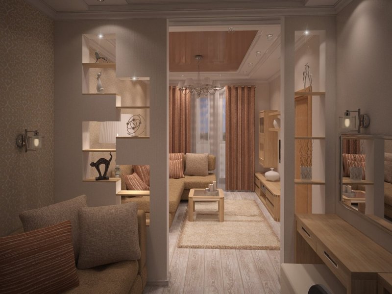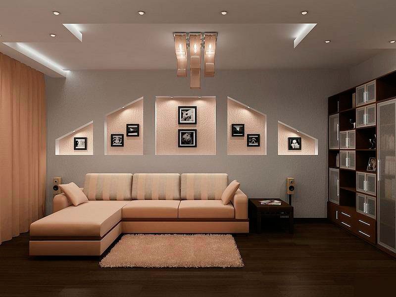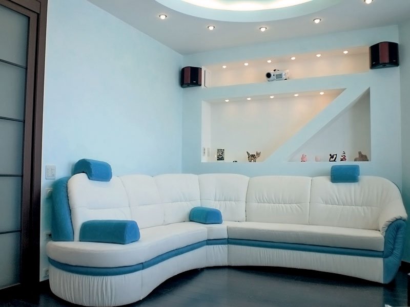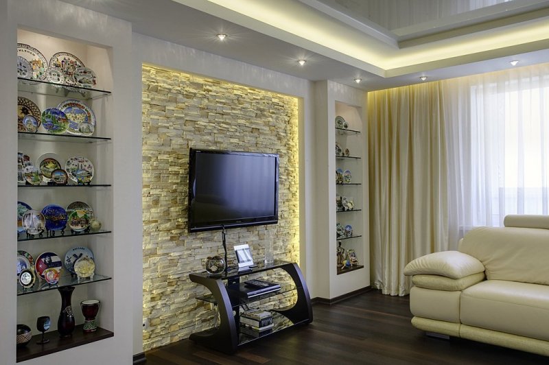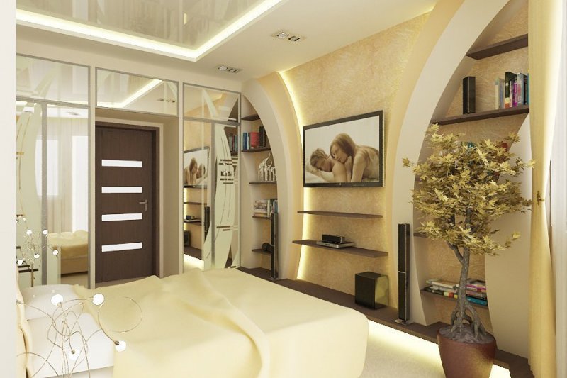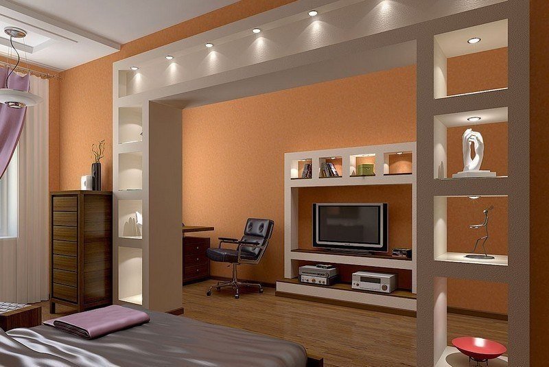Отделка стен гипсокартоном часто применяется при обустройстве помещений. Это позволяет легко выровнять поверхность, без нанесения штукатурки. Гипсокартонные листы (ГКЛ) имеют гладкую лицевую сторону, которая полностью готова к нанесению финишных покрытий, строительных смесей, шпаклевки, краски, обоев, декоративной плитки. Часто этот материал используют для создания фигурных интерьерных конструкций, арок, ниш, полок, перегородок. Для помещений с повышенной влажностью существуют разновидности гипсокартона, которые хорошо противостоят влаге и могут применяться в подобных условиях. Это практичный, простой в работе материал имеет множество достоинств и особенностей. Содержание Преимущества и недостатки Рельефная отделка стен Арки из гипсокартона Ниши Декоративные перегородки Полки из гипсокартона Как правильно подготовить гипсокартон к покраске Заключение Преимущества и недостатки В использовании гипсокартона можно отметить несколько плюсов: экологически чистый и безопасный для здоровья; подходит для оформления любых помещений; прост в монтаже; превосходно маскирует дефекты поверхностей и коммуникации; обладает хорошей тепловой и звуковой изоляцией; создает комфортный микроклимат; полностью готов к нанесению финишных покрытий; доступная стоимость. В гипсокартоне нет синтетических добавок и токсических веществ, его смело можно признать экологически чистым и безопасным. Материал превосходно поддается обработке и видоизменению. Благодаря этому легко создаются сложные рельефы и конструкции. Трубы, проводка, пустоты в стенах, различные коммуникации быстро и аккуратно маскируются при помощи гипсокартона. Он обладает свойствами поглощать и отдавать влагу, регулировать оптимальные климатические показатели в помещении. Лицевая поверхность материала практически полностью готова к декоративной облицовке. Стоимость отделки ГКЛ обойдется дешевле чем штукатурка, при этом сам процесс будет происходить намного проще и чище. К недостаткам относится хрупкость и неустойчивость к сильным воздействиям воды. Если в комнате прорвет водопровод и произойдет затопление, то при длительном контакте с водой, даже влагостойкий гипсокартон разбухнет, деформируется и испортится. Сильные удары повреждают гипсокартонные поверхности, а полки, стеллажи изготовленные из этого материала не выдерживают слишком тяжелых предметов. Но при повреждении гипсокартона, его легко отремонтировать. А если не допускать длительного взаимодействия с большими объемами воды, то можно считать, что он практически не имеет недостатков. Рельефная отделка стен Применяя гипсокартон в интерьере возможно создать любую рельефную композицию, воплотить самые интересные идеи. Для этого предварительно нужно спроектировать каким именно узором или формой вы хотите украсить стены. Далее подготавливается помещение, освобождается рабочее пространство. Поверхность необходимо очистить, прошпаклевать имеющиеся трещины и можно наносить разметки для будущей рельефной композиции. По размеченным линиям устанавливается профильный каркас, который впоследствии обшивается гипсокартонными листами при помощи саморезов. Получившуюся фигуру следует зашпаклевать, после чего ее можно украшать красками, обоями, декоративным камнем или плиткой. На стене, обшитой гла