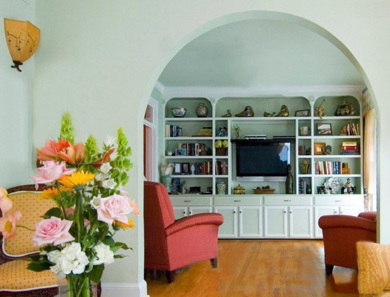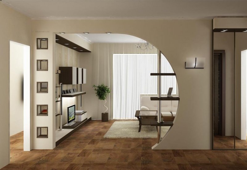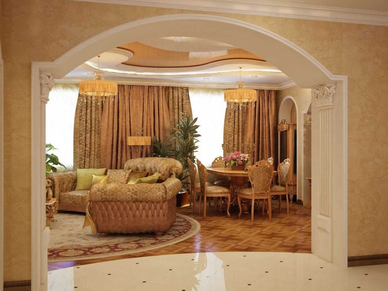 В современных интерьерах, особенно в гостиных и прихожих, часто встречаются арочные конструкции различных видов. Самыми популярными являются классические и купольные оформления дверных проемов. Также, при помощи декоративной арки, разделяется помещение на отдельные зоны. Сама конструкция может быть простой или иметь изогнутые плавные линии, узорные вырезы. Это зависит от фантазии исполнителя. Заниматься созданием арки должен опытный мастер, так как этот процесс предполагает точные расчеты и определенную сноровку.