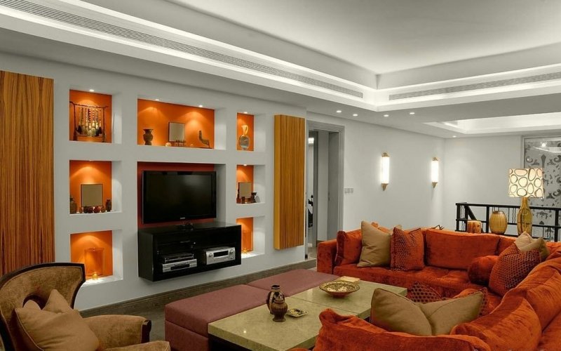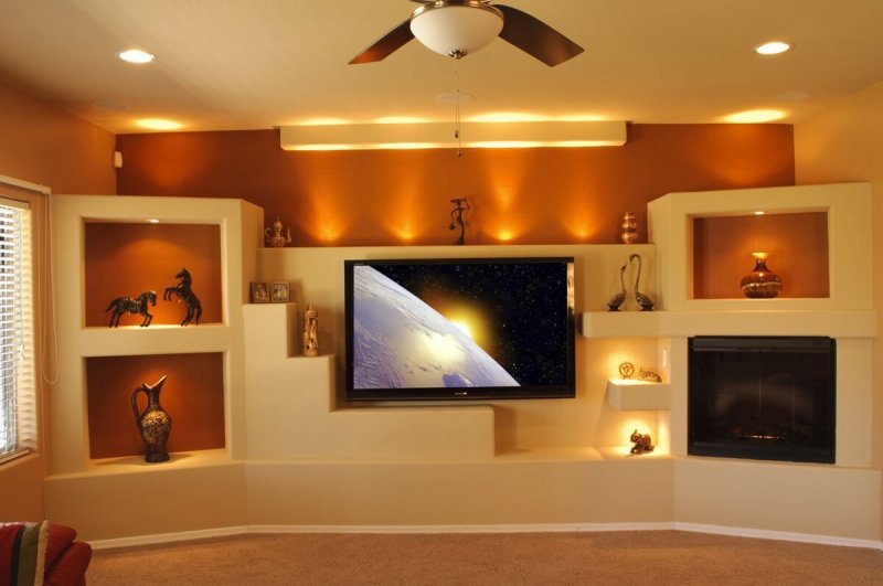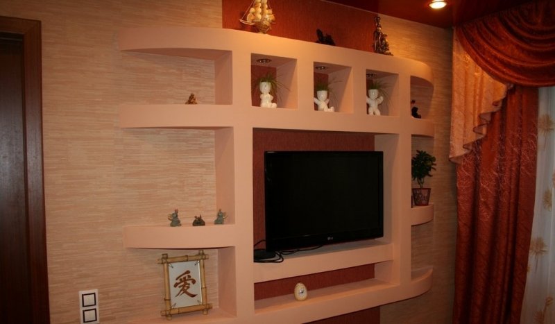 В помещении легко создать из ГКЛ красивую функциональную полку, а можно совместить много таких элементов в одной общей композиции и получится своеобразная мебельная стенка. При этом она будет идеально подходить к стилю и габаритам комнаты.