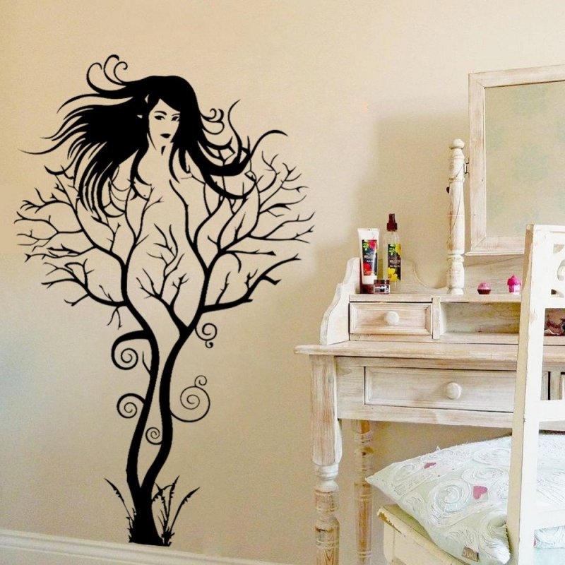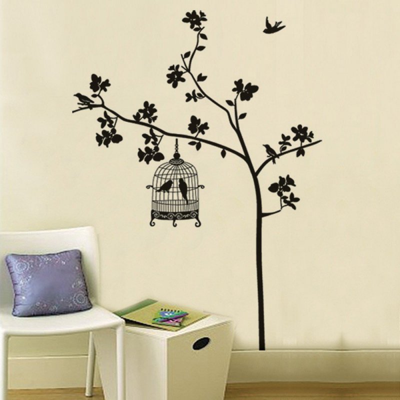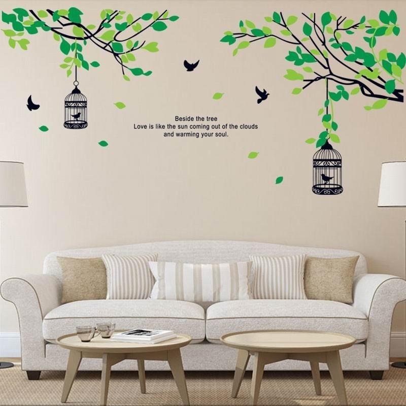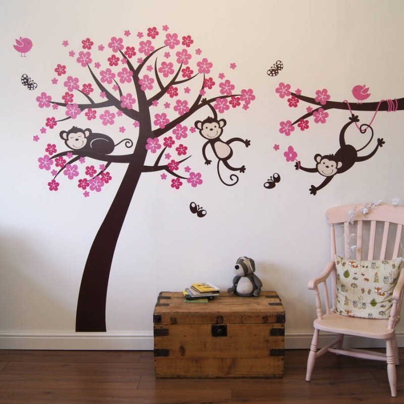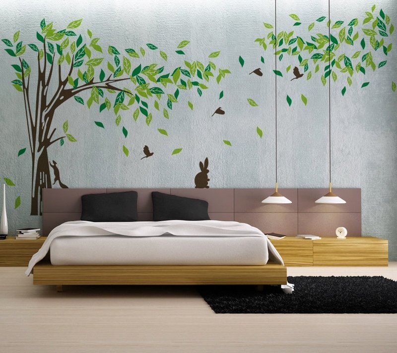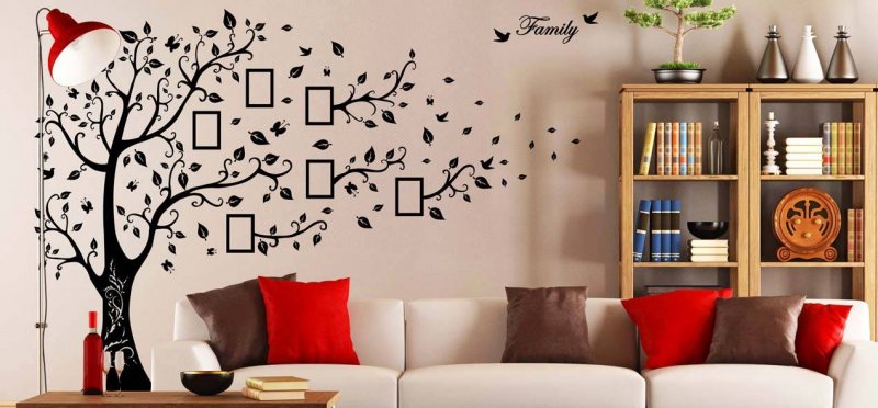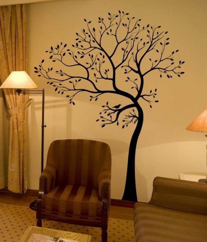 Декоративный элемент в виде дерева очень популярен в современных интерьерах. Такой декор не имеет фона, поэтому наклеенное изображение выглядит так, будто его отдельно нарисовали на стене. Само дерево может быть абсолютно любым, зеленым, цветущим, осенним, с плодами, сказочным или с фантастическими витиеватыми ветвями. Если на таком изображении разместить семейные фотографии в рамках, получится оригинальное генеалогическое древо. Также на ветвях можно расположить птиц или зверьков, в результате выйдет интересный сюжет. А новогодняя елка-наклейка вполне может заменить настоящее дерево на время зимних праздников.