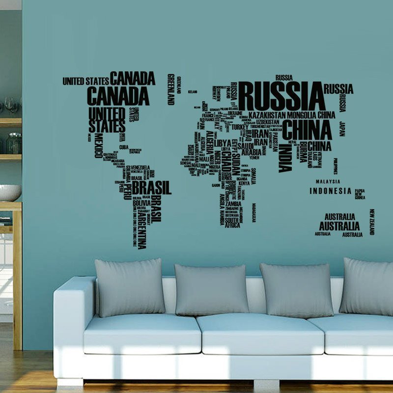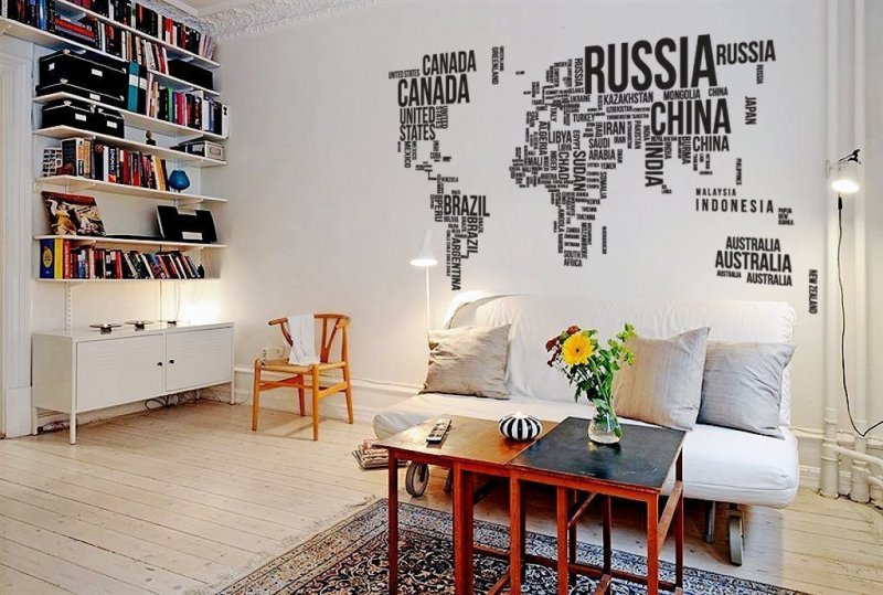 Крупные изображения занимают большую часть стен при этом кардинально меняется дизайн помещения, зрительно расширяется жилое пространство. Это может быть необычная географическая карта мира, огромный букет цветов, сюжетная композиция ночного города с силуэтами двух влюбленных, изображение царственного льва или величественного мамонта. Вариантов великое множество. Некоторые декоративные наклейки могут выглядеть как большие картины известных художников или как реалистичная фотография с 3D эффектом на всю стену.