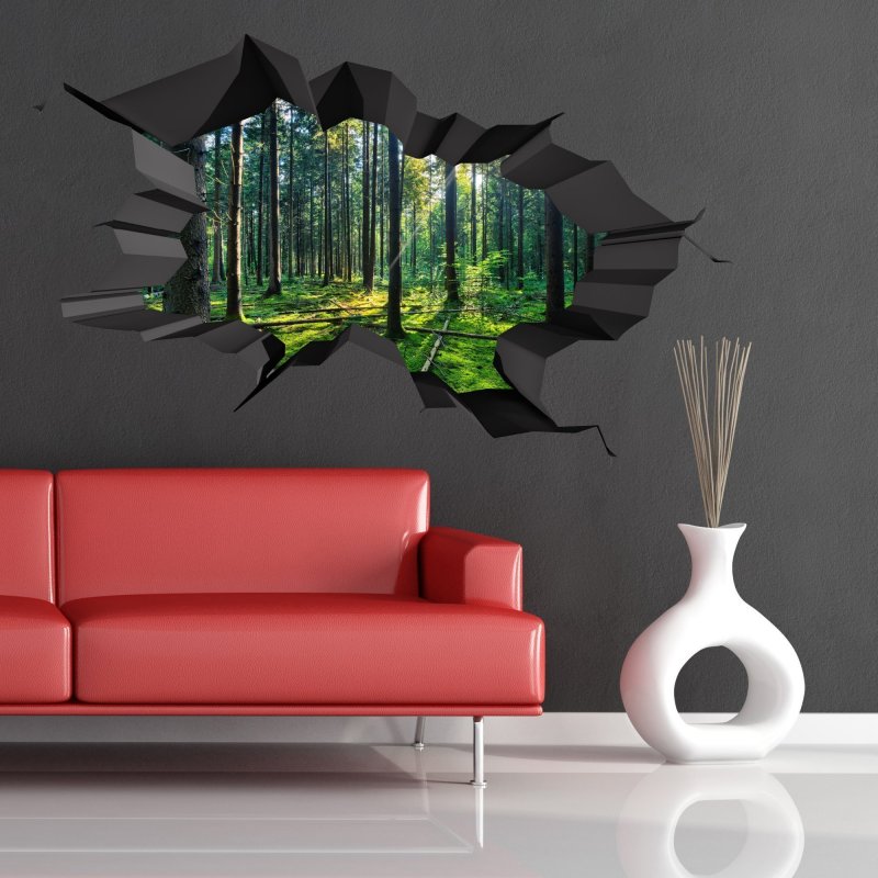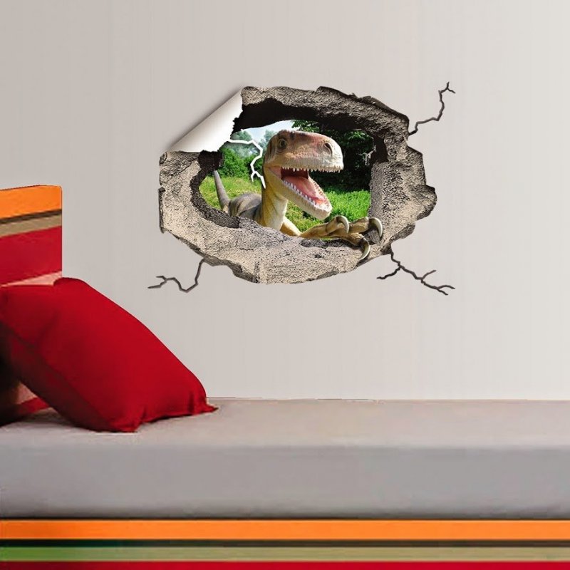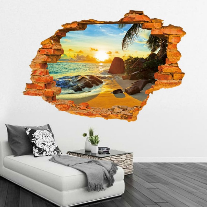 Изображения с оптической иллюзией впечатляют реалистичностью и создают потрясающую атмосферу в помещении. 3D наклейки выглядят как объемные элементы или как сюжетные композиции с эффектом присутствия. Иллюзия распахнутого окна, выводящего на городской пейзаж или разрушенной стены, за которой располагается потрясающий тропический остров, притягивает внимание и завораживает. Объемные изображения также искусно имитируют различные предметы и природные явления.