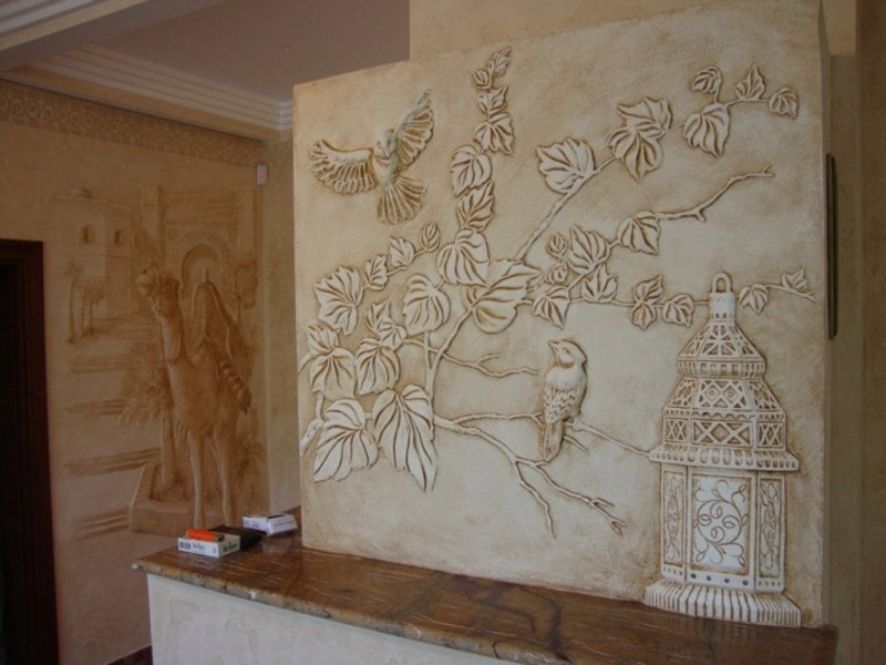 Для выполнения этой работы используются гипсовые строительные смеси, металлические, резиновые шпатели. На размещенный эскиз наносится гипсовый раствор в те участки, куда необходимо добавить объема. Процесс напоминает работу скульптора, требует особой внимательности и терпения. Раствор нужно готовить небольшими порциями, так как он быстро застывает и становится твердым. После того как объемная композиция высохнет, ее можно дополнительно оформить красками. В большинстве случаев такие изображения выглядят завершенными и без добавления красок.