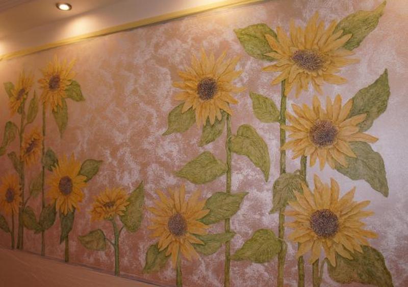 Текстурные, фактурные штукатурки могут стать замечательной основой для создания художественной композиции. Подобное основание позволяет получить очень интересные визуальные эффекты и различные фактуры. Некоторые работы, выполненные на декоративной штукатурке, напоминают старинные фрески или завораживающие рельефные картины. При правильном сочетании типа поверхности и выбранного рисунка, можно получить необычайно живописное изображение, которое будет поражать своей реалистичностью. Роспись по декоративной штукатурке — это настоящее искусство, которое требует знания технологий, опыта и руки мастера. С такой работой могут справится только профессиональные художники. Но даже простой незамысловатый сюжет, выполненный своими руками на текстурной поверхности будет выглядеть особенно интересно.
