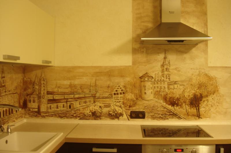 Здесь не рекомендуется размещать элементы росписи вблизи плиты, ведь исходящий жар может испортить художественную работу. Для кухни подходят различные натюрморты, ветки деревьев с плодами, например, оливковые, яблочные, виноградные, лимонные. Также помещение можно украсить скандинавскими узорами или этническими орнаментами.