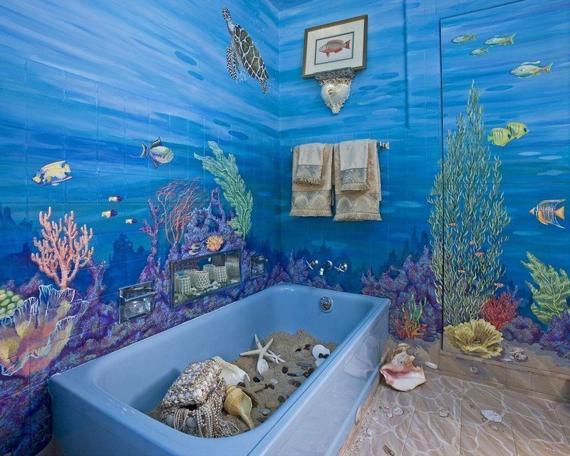 Из-за повышенной влажности в помещении следует использовать водостойкие краски, вполне подойдут акриловые. Для росписи в ванной идеально впишется тематика, связанная с водой. Например, пейзажи морского дна, римских терм, фонтаны, водопады, жемчужины в больших раковинах и так далее.