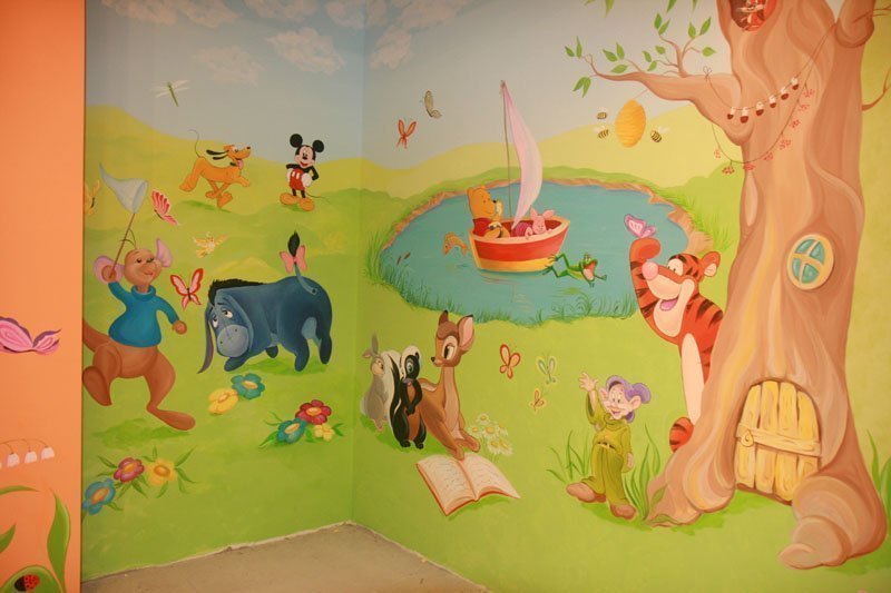 Для детей помладше можно изобразить сказочные пейзажи с забавными и любимыми персонажами. В оформлении комнаты малыша нужно использовать теплые цвета, которые будут приятными для зрительного восприятия крохи. Подросткам понравятся модные аниме, красочные комиксы, спортивная или музыкальная тематика. Перед выбором рисунка полезно будет посоветоваться с ребенком, который поведает о своих предпочтениях, фантазиях и может подать интересную идею для будущей декоративной росписи в детской.