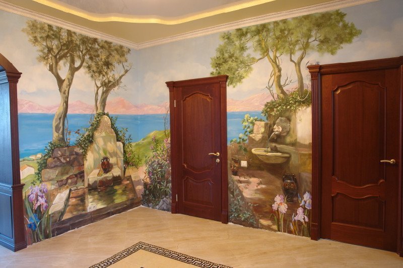 Художественная роспись интерьера часто становится визитной карточкой престижного заведения, эффектно подчеркивающей индивидуальность.