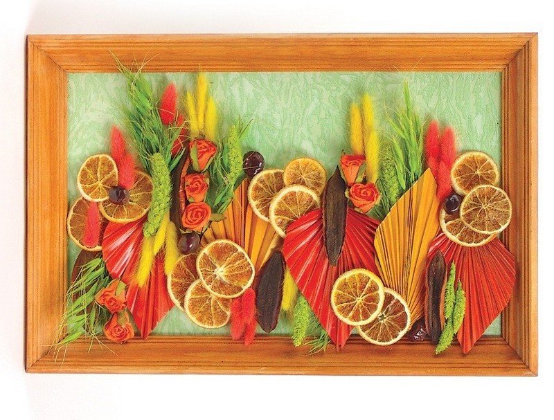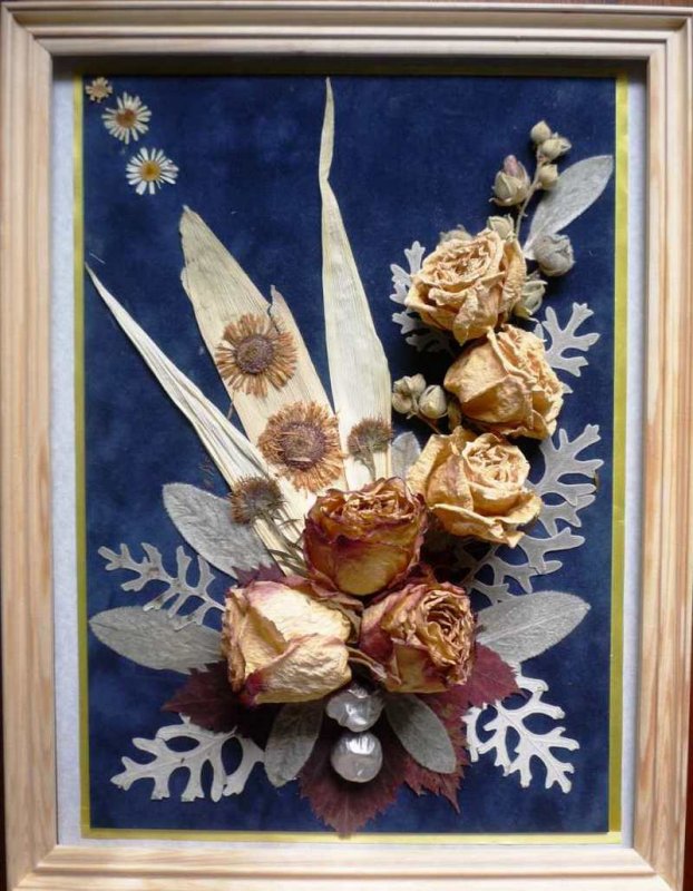 Отлично подходит для детского творчества. Определяемся с сюжетом будущей работы, а затем на твердую основу (картон, ДВП) с помощью клея приклеиваем засушенные цветы и листья (веточки можжевельника, листья деревьев — подойдет любая флора). Отличным дополнением станут зернышки, семечки и веточки.