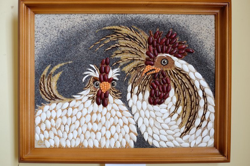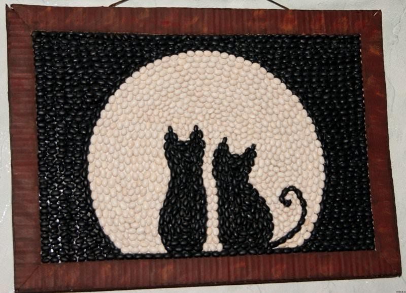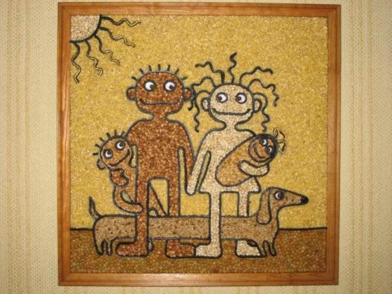 На твердую, уже окрашенную основу наносится эскиз будущей картины. Затем, крупа и семечки крепятся на основу с помощью клея ПВА. Крупные зернышки нужно клеить каждую индивидуально, а мелкую россыпь, к примеру, рис, следует насыпать на уже нанесенный на основу клей.