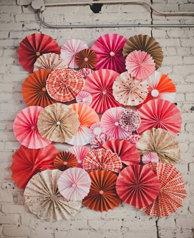 Множество кругов соедините вместе, прикрепляя их к стене английскими булавками. Размер кругов и самой композиции может быть каким угодно большим и принимать любую форму.