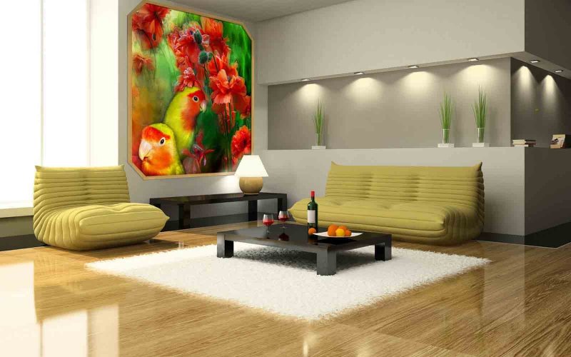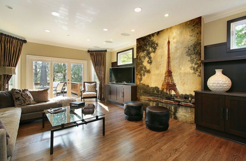 Здесь дизайн ограничивается лишь Вашей фантазией! Сочетайте цельные куски обоев с мелкими вырезанными фрагментами. Это современный и недорогой способ украсить свой дом. Важно! Если не можете определиться со стилем будущей композиции, то стоит присмотреться к изображению цветов и растений в неярких оттенках. Это всегда уместно и красиво смотрится.