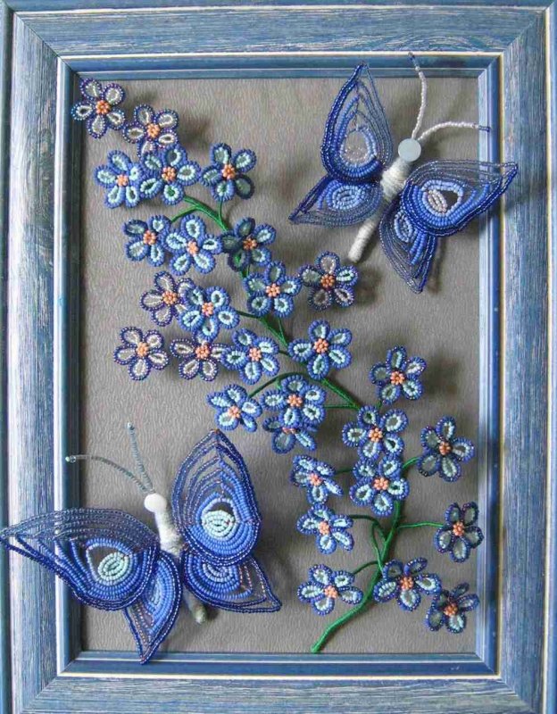 В этом варианте панно все или часть его элементов выполнены из бисера. Для начала делаются сами элементы, а потом уже закрепляются на основу и, по желанию, оформляются в рамку.