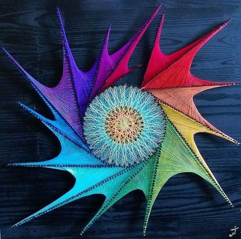 Весь смысл в том, что на твердую основу забиваются гвоздики. Это можно сделать хаотично, а можно и по определенной схеме, которые с успехом можно отыскать в интернете. Между гвоздями в несколько слоев натягиваются нити. Благодаря этому, создается некий рисунок.