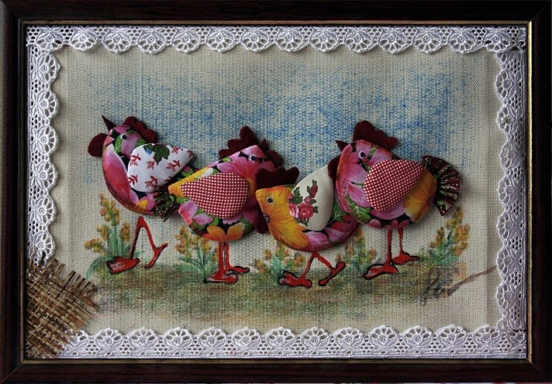 Если за основу берется кусок картона, холст или любая другая твердая поверхность, то на ней делаются разметки: где и как будут располагаться элементы декора. Если основа-ткань, то она натягивается на основу (например, на кусок фанеры, доски или пластика), а остаток ткани закрепляется с тыльной стороны. После того, как поделка будет выполнена, ее помещают в рамку и вешают на стену.