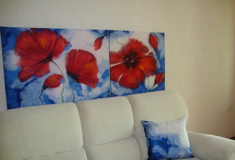 Панно из фетра является одним из самых популярных среди рукодельниц. Нужны лишь кусочки фетра разных цветов, выкройка будущих деталей картины, нитки с иголкой либо клей и основа, на которую планируется закрепить все детали панно. Фетр — очень благодатный для творчества материал: он поможет воплотить все фантазии в жизнь. Панно из фетра станет отличным украшением гостиной или прихожей.