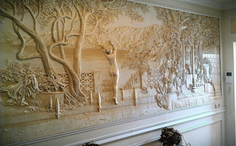 Весьма затратный и трудоемкий процесс. Все выполняется на заранее оштукатуренной поверхности. Делается набросок рисунка, а затем специальная штукатурка наносится с помощью трафарета или самостоятельно корректируется инструментами. Этот вид используется для украшения стен и потолков разнообразными изображениями.