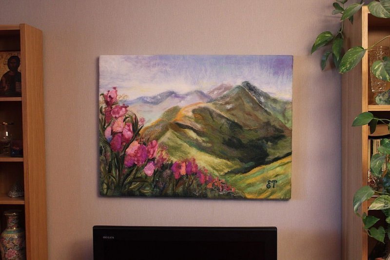 Панно из шерсти является самым простым изделием в технике мокрого валяния. Это интересный процесс, в котором шерсть уплотняется определенным способом для того, чтобы получить войлок. Рисунок на таком панно может быть любым: все зависит от мастерства рукодельницы.