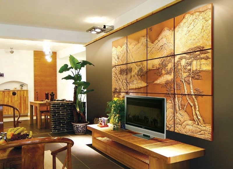 Выполнены обычно в абстрактном стиле из самых разных пород дерева. Очень выгодно в классическом интерьере смотрятся деревянные панно с инкрустированными полудрагоценными камнями.