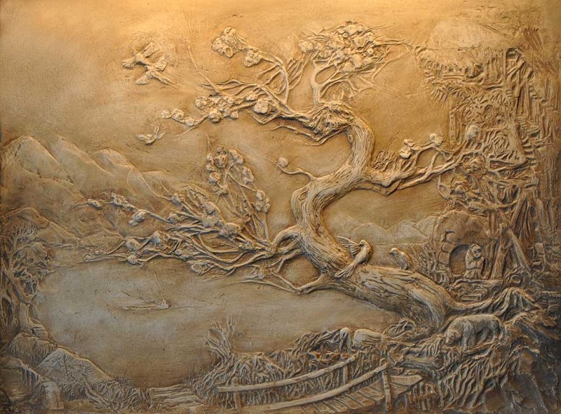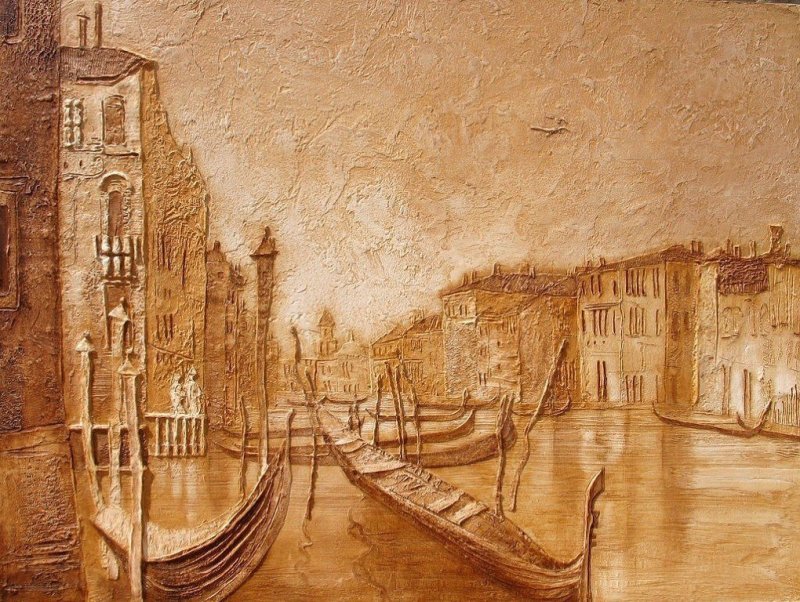 По аналогии похоже на процесс изготовления из декоративной штукатурки. Возможно, потребуется чуть больше трудозатрат, ведь все рельефы в изображении на панно выполняются при помощи специального шприца или шпателя.