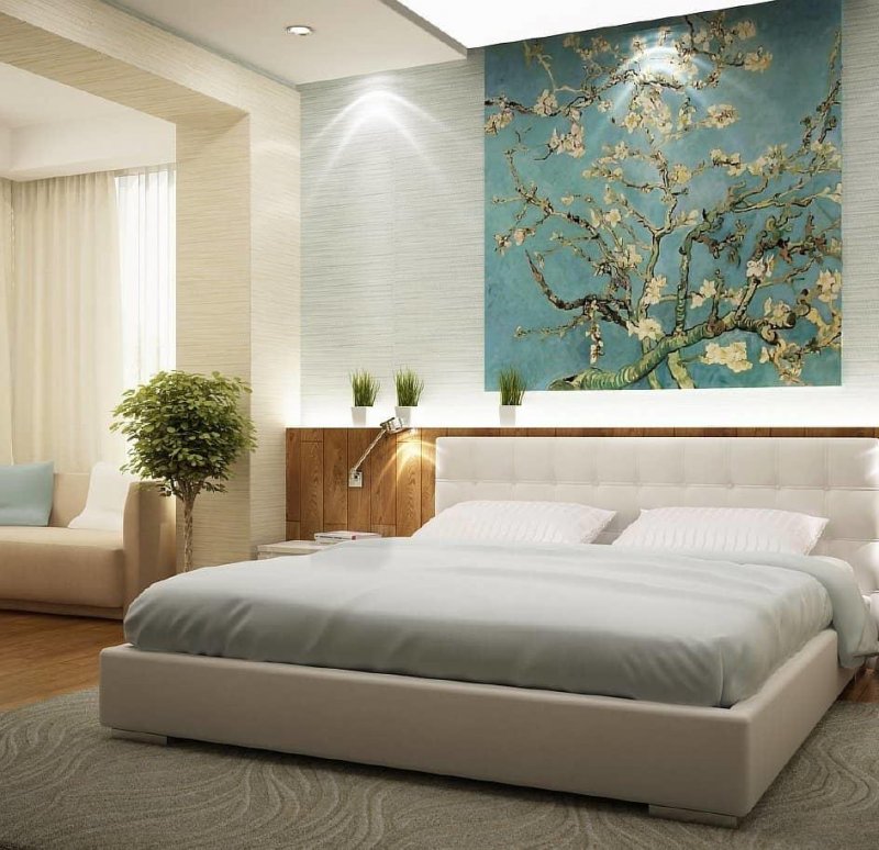 Берем обои с нужным изображением (например, веткой сакуры), аккуратно вырезаем его и вставляем в рамку, либо приклеиваем на стену и украшаем молдингом или панелями.