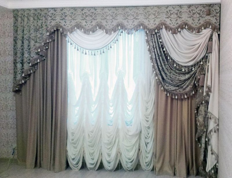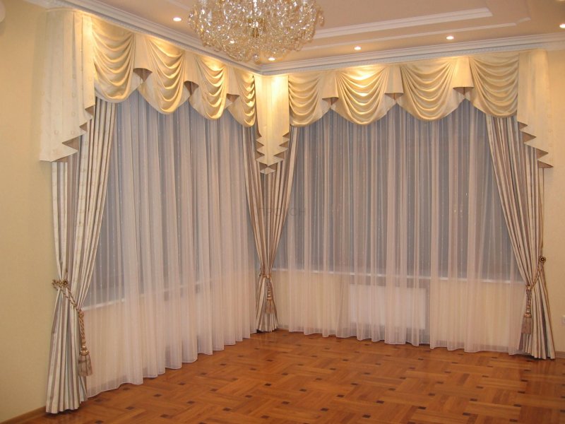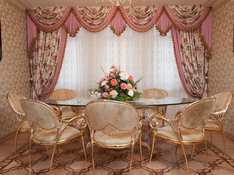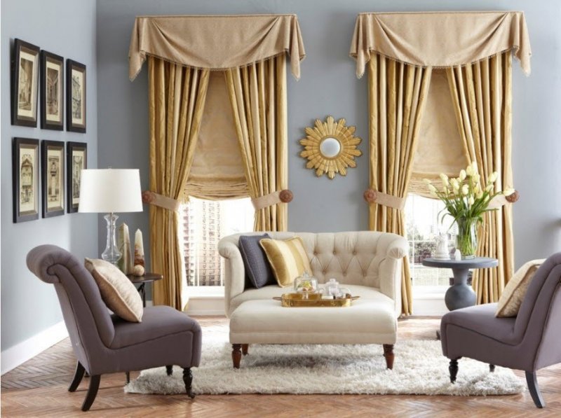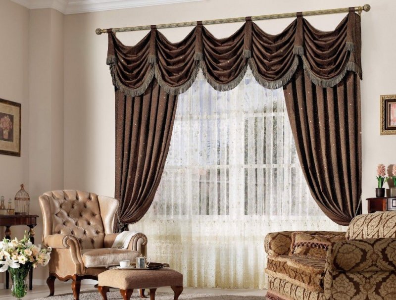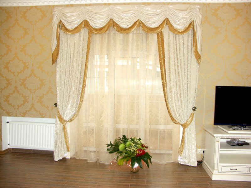 Классические: имеют прямоугольную форму, декорируются вставками и разнообразными украшениями. Одновременно с портьерами, этот стиль включает в себя гардины и ламбрекены.
