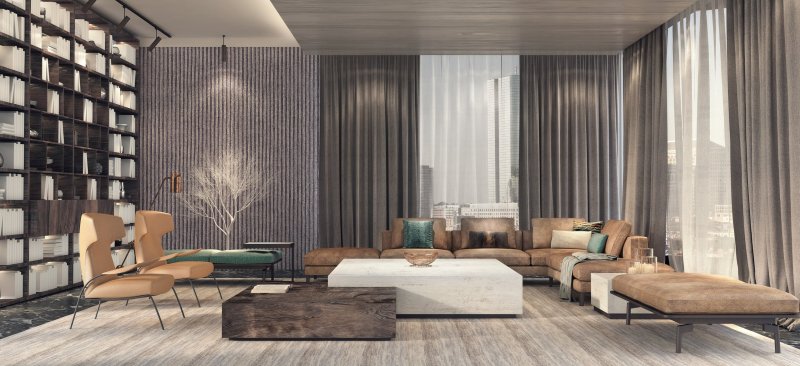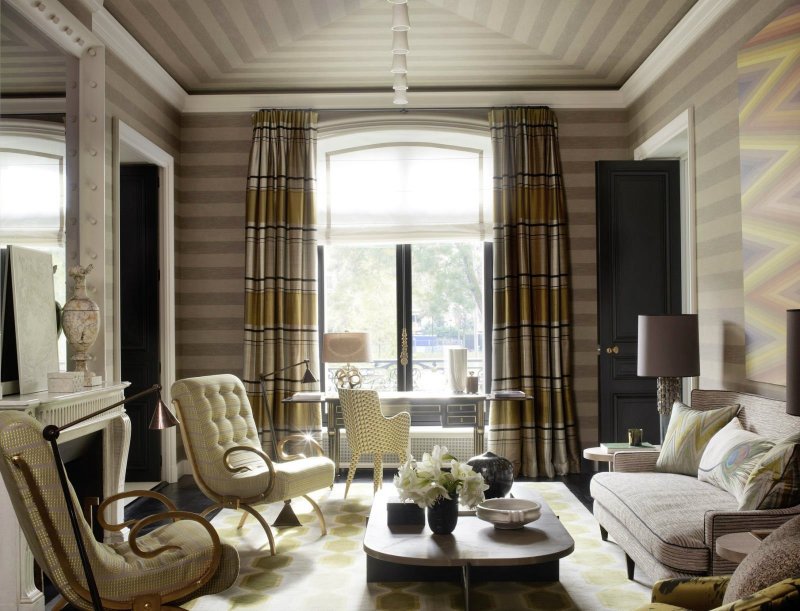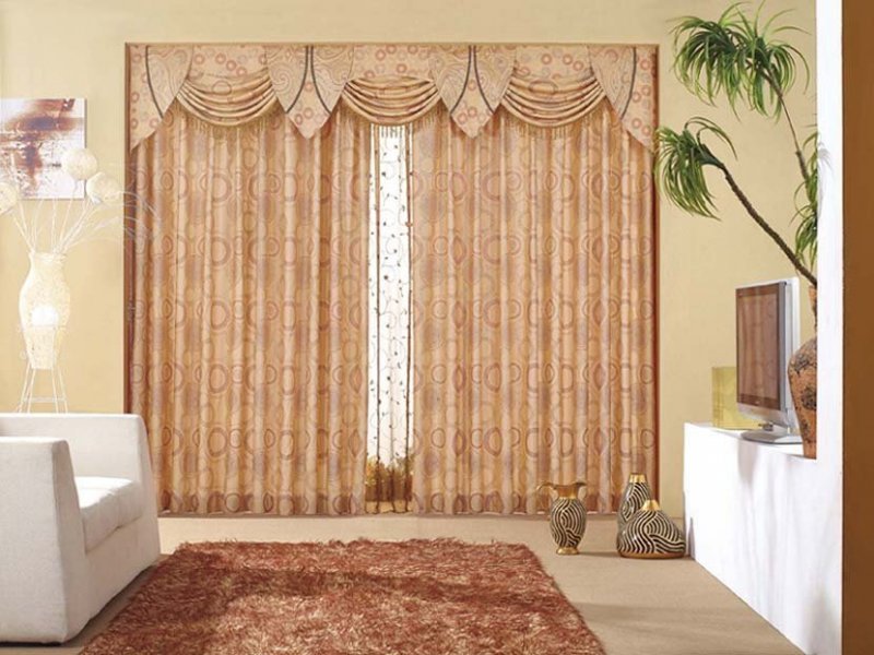 Если дизайн комнаты пестрит различными узорами и рисунками на мебели, обоях или половом покрытии, то стоит выбирать портьеры более спокойных и сдержанных оттенков. Можно выбрать однотонную ткань, которая поддержит основной цвет в интерьере.
