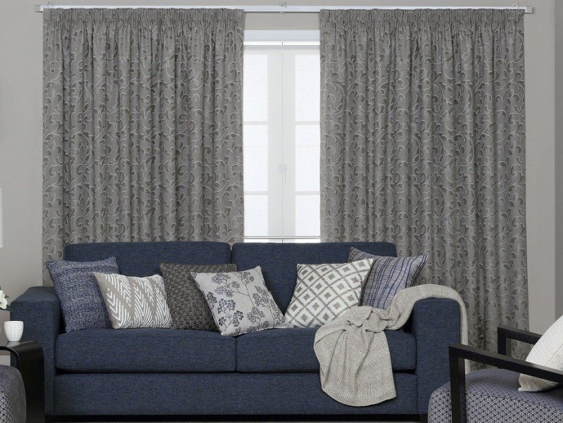 Если обои и мебель в комнате, в основном светлые, например, серые или бежевые, то синие, голубые и бирюзовые тона на орнаменте штор будут смотреться очень выигрышно. Такое сочетание идеально подойдет для оформления гостиной или кухни.