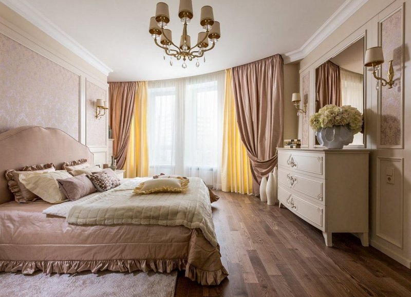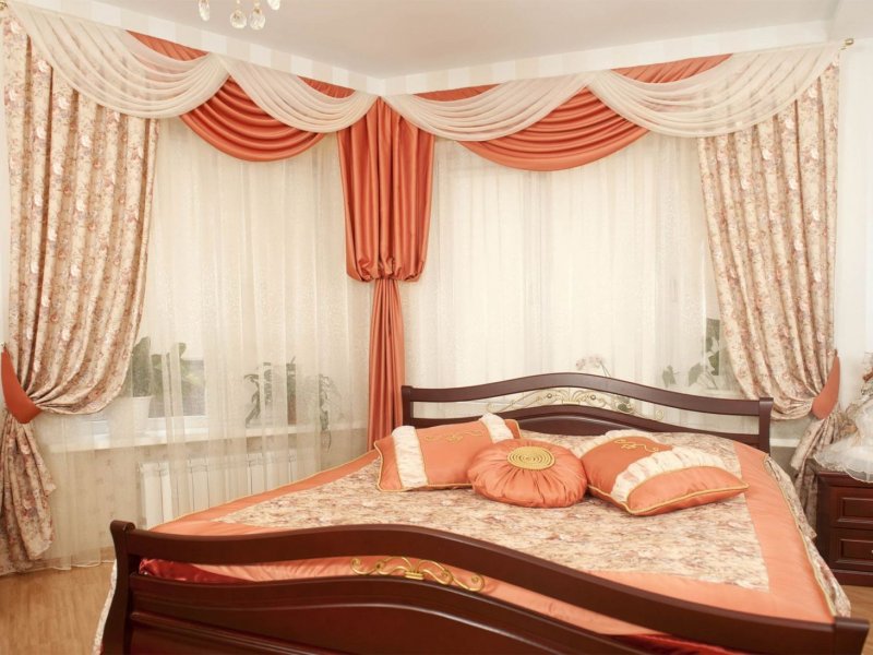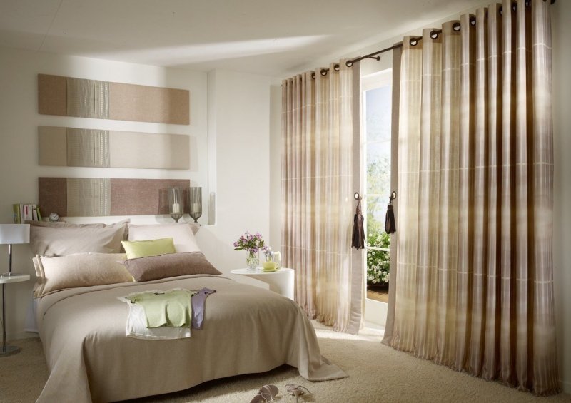 Здесь, чаще всего, используются плотные портьеры, не пропускающие солнечные лучи. Цветовая гамма для спальни выбирается в спокойных и сдержанных тонах.