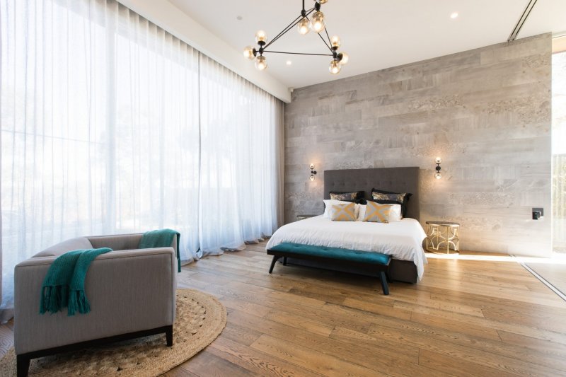 Для коррекции широкого окна отлично подойдут шторы-панели. Это вариант портьер выполнен из текстиля или тюля, с утяжелением внизу, что придает им форму идеально ровных полос.