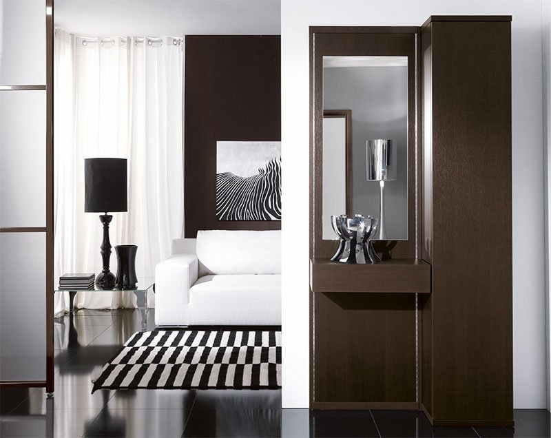 В малогабаритной прихожей уместно будет смотреться мебель венге комбинированная со светлыми оттенками. В тон светлой части древесины подбирается декор для стен. Это могут быть обои, бамбуковые полотна, деревянные декоративные рамки и другие детали. Шторы часто подбираются на тон светлее мебели. В маленькие помещения стоит добавить зеркальных элементов и тщательно продумать схему освещения. В больших просторных прихожих допустимо использовать темные шкафы, комоды. Декорировать стены можно стеновыми панелями, обоями. Кирпичная кладка тоже гармонично смотрится на стенах. В комнате желательно использовать глянцевые и матовые поверхности.