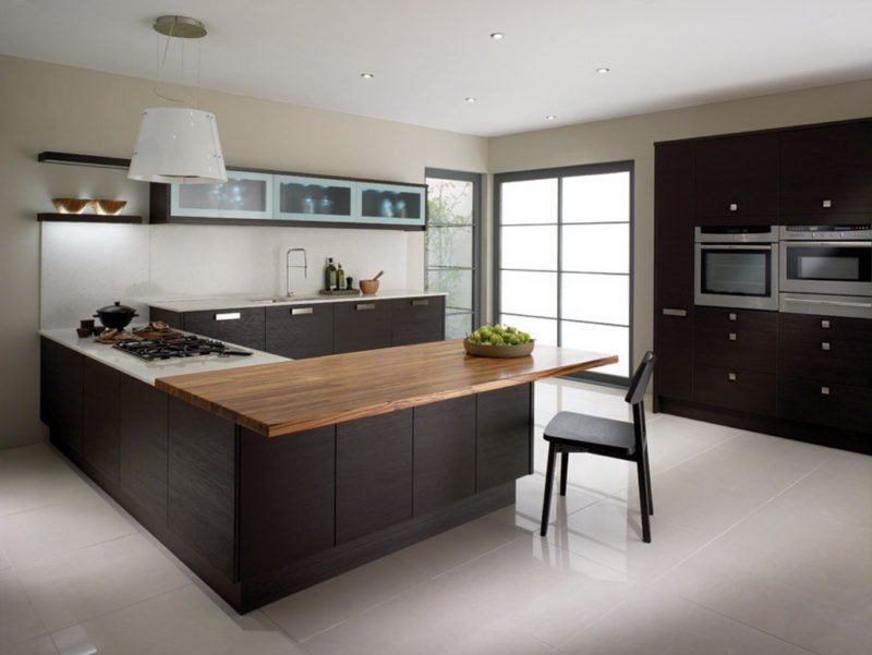 Венге подходит к интерьеру просторной кухни. В малогабаритных помещениях в 7 квадратных метров и меньше, лучше не использовать много темных цветов. Допускается применять небольшие фрагменты. Высокое качество древесины уместно в местах, где ежедневно происходит много рабочих процессов. Темные участки отделки считаются самым практичным вариантом. В кухне, для удачного сочетания с венге, следует выбирать белый, молочный ванильный, постельные бежевые тона. К выбранной гамме подбираются приятные акценты, оригинальные полочки, декоративная посуда, красочные изображения и другие детали.