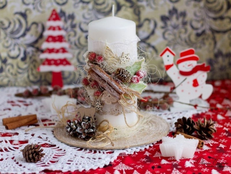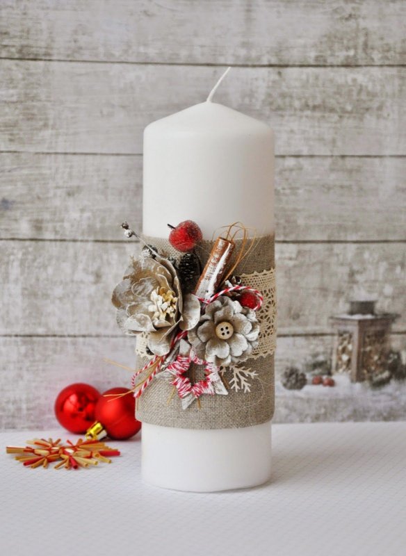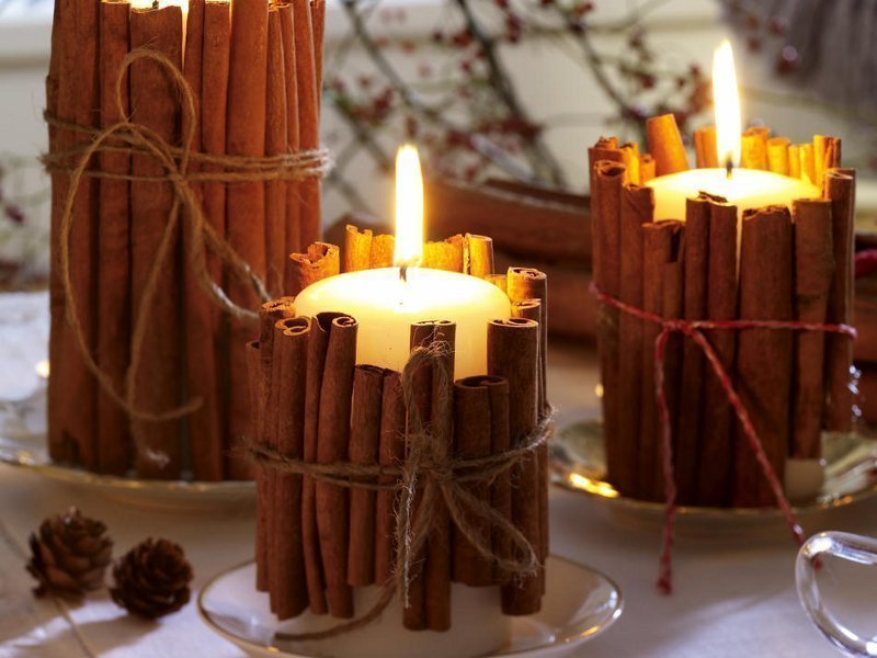 Природные материалы – это настоящей разгул фантазии для декорирования новогодних свечек. Первое, что приходит в голову, это традиционные шишки, еловые или сосновые. Более нетрадиционная идея – украшение палочками корицы, берестой, кофейными зернами, кукурузными початками, хвоей и папоротником. Такая композиция украсит камин или празднично накрытый стол. Корица, кстати, одновременно служит и ароматическими палочками.