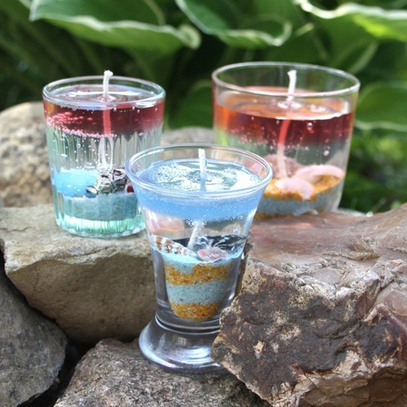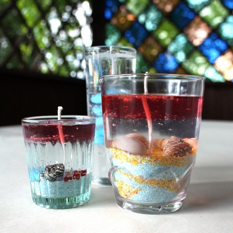 Теперь – сам мастер-класс. Например, чтобы сделать свечу морской тематики, в качестве декора используем цветной песок. Насыпьте на дно стеклянного сосуда немного цветного песка. Это дно моря-океана. Теперь нужно минеральное масло для пропитки декора. Это нужно для того, чтобы в теле будущей свечки не образовывались многочисленные пузырьки. Пропитывают маслом и другие элементы «морского дна»: камешки, раковины и т. д. «Искупайте» в масле и фитиль. Минеральное масло есть и в составе свечного геля, поэтому визуально в готовом изделии оно будет незаметно. Разместите декоративные элементы внутри стеклянного сосуда, закрепите на дне фитиль. Теперь настало время для того, чтобы заняться свечным гелем. Расплавлять его можно на водяной бане или непосредственно на плите в стальной емкости. Добавьте в гель краситель для получения голубоватого оттенка. Залейте гелем декор и подрежьте фитиль. Свеча морской тематики готова. Вам кажется это слишком сложно? Вот самый простой вариант: возьмите обычные скорлупки от яиц, вставьте фитиль, удерживая его палочками для суши, затем залейте скорлупки разноцветным гелем. Цвета – любые. Быстро и красиво!