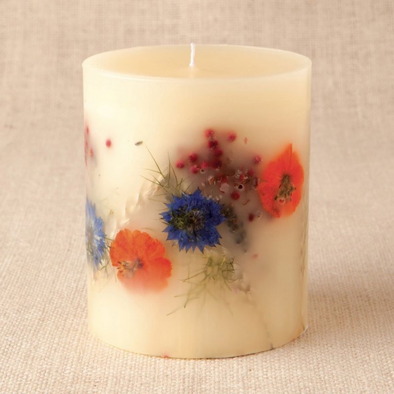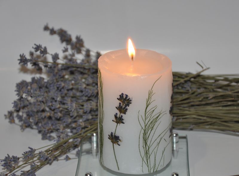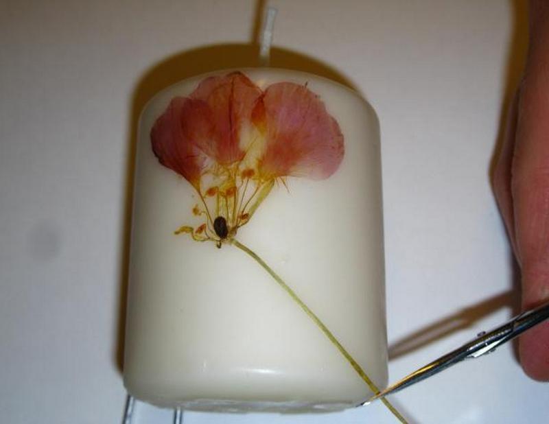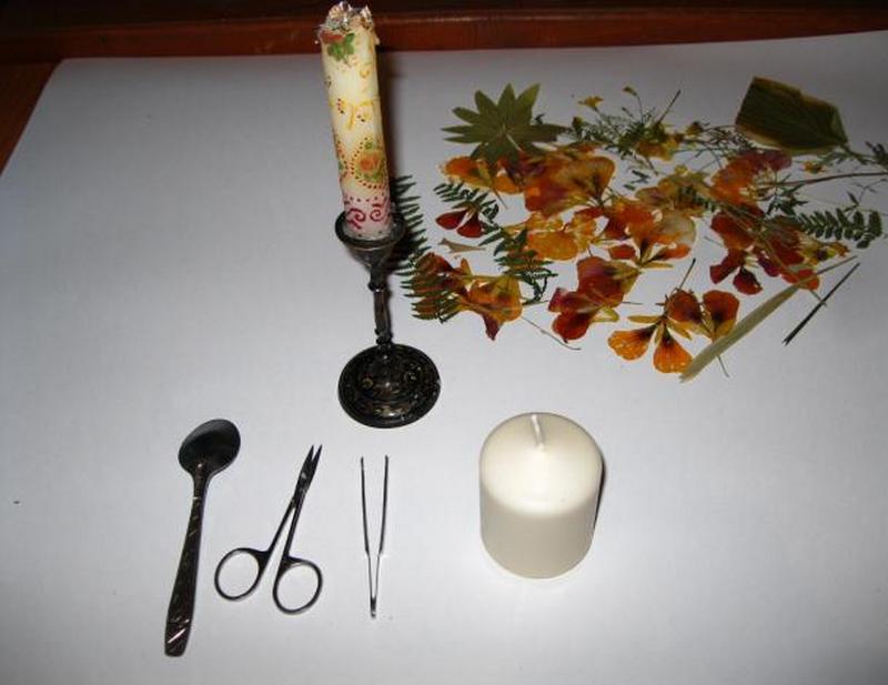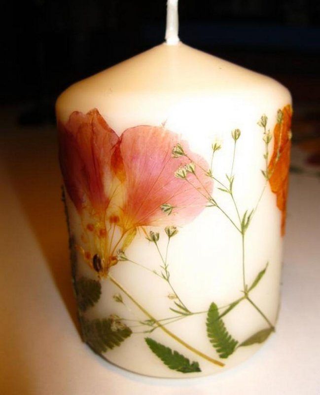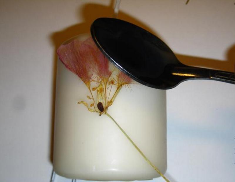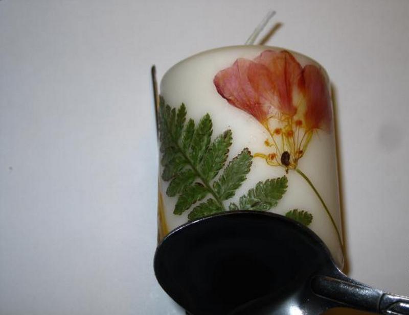 Зажгите рабочую свечу, нагрейте над ее пламенем ложку, выпуклой стороной вверх. Возьмите сухоцвет, прижмите к поверхности декорируемой свечки. Начните аккуратно приглаживать его ложкой. Следите, чтобы цветок прилип полностью, и лепестки не торчали. Проведите по стеблю чуть сильнее, вдавливающим движением. Отрежьте лишнюю часть стебля. Далее подбираете сухоцветы по своему вкусу и действуйте аналогичным образом. В любом случае, у вас получится уникальное украшение для интерьера. Для крепления самых нежных элементов используйте клей для декупажа. Последний этап – это закрепление результата. Выньте из «рабочей» свечи фитиль, растопите ее на медленном огне. Следите при этом, чтобы парафин не закипел. Окуните в подготовленный парафин декорированную свечу, держа ее за фитиль. Одного раза, как правило, бывает достаточно.