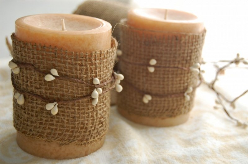 Оказывается, что грубая мешковина – красивый элемент декора, которым можно задекорировать даже свечи на свадебный стол. Оригинально смотрится сочетание, например, мешковины с кружевом, бисером или атласными лентами. Можно использовать этот материал, если свадьба выдержана в деревенском стиле.
