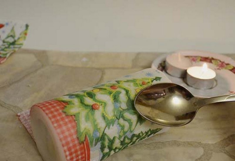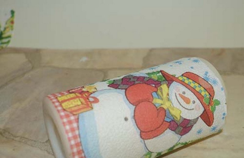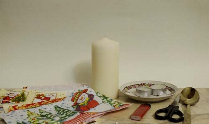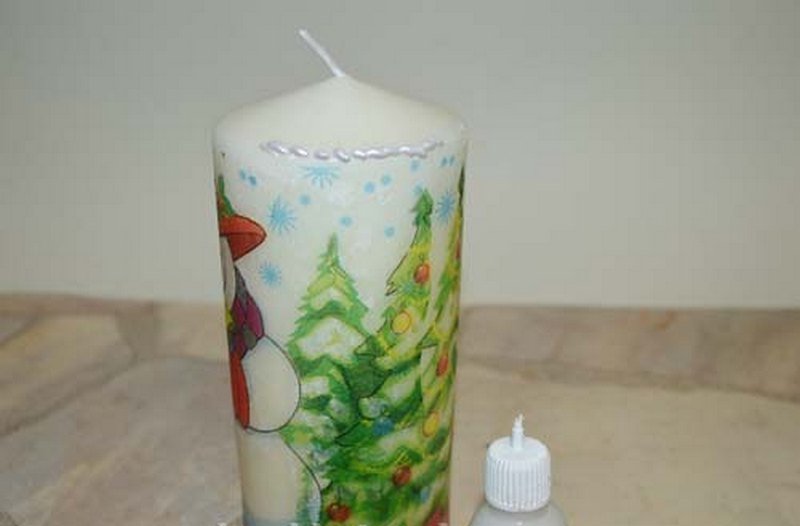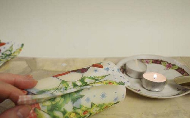 Определитесь с длиной бумажного отрезка. Особенно это касается полного декорирования изделия. Отрежьте бумагу так, чтобы шов получился незаметным. Поэтому вырезайте с запасом примерно по 1 см по длине и ширине. Если вы пользуетесь многослойной салфеткой, удалите 2 нижних слоя. Для работы понадобится лишь верхний слой, на который нанесен рисунок. Этим моментом пренебрегать нельзя. В противном случае, изделие получится пожароопасным. Далее действуйте в таком порядке (пошагово):