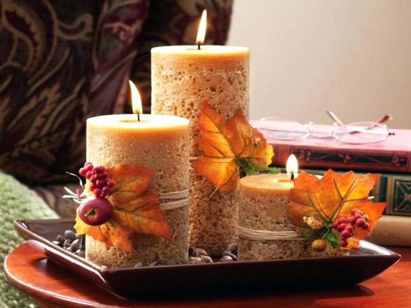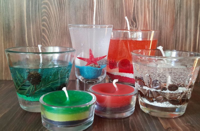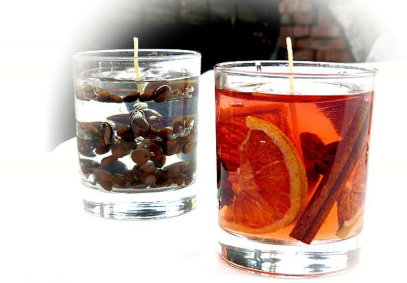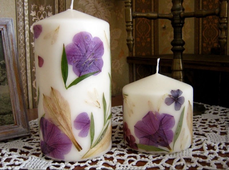 Свечи прекрасно украшают интерьер, создают домашний уют. Но обычные изделия даже в изысканном подсвечнике смотрятся недостаточно нарядно. Идеи, изложенные в этой статье, помогут вам создать настоящие произведения искусства при минимальных затратах времени и средств. Большую часть декоративных элементов вы сможете найти дома в ящичке для рукоделия, на кухне или в саду на даче. Содержание Виды свечей Идеи Гелевая свеча Декор сухоцветами Вкусные свечи Новогодние Из мешковины На Хэллоуин Декупаж Заключение Виды свечей Главный классификационный признак, по которому различают свечи, — это материал изготовления. Вот свечки, которые на сегодняшний день используют для различных целей. Хозяйственные Материал их изготовления – парафин. Их отличает простейшая цилиндрическая форма и белый цвет. Это самый распространенный и недорогой вариант. Столовые Могут иметь простую цилиндрическую или сложную форму. В состав такого изделия добавляют ароматизаторы и красители. Пеньковые Устойчивые цилиндрические изделия большого диаметра. Церковные Их изготавливают из парафина или натурального пчелиного воска, для использования в культовых и ритуальных целях. «Таблетки» Эти свечки называют чайными, поскольку они используются, помимо аромаламп, для подогревания заварочных чайников. Декоративные Это многоцветные, украшенные декором, резные изделия, а также свечи-статуэтки. Гелиевые Эта разновидность – самая декоративная. Гелевую массу заливают в стеклянный сосуд, где, помимо фитиля, находятся декоративные предметы. Сальные Фитиль в таких изделиях тростниковый. Горит такое изделие не слишком ярко, но расходуются экономно. Электронные Это стаканчик из полупрозрачного материала, оснащенный лампочкой и микросхемой, благодаря которой лампочка мерцает. Идеи Может, какая-то изложенная в статье идея вам понравится, и вы захотите что-либо воплотить в жизнь. Гелевая свеча Гелевые изделия смотрятся очень красиво и необычно. Вариаций может быть множество: аквариум, новогодние шарики, изделие из геометрических тел, цветок, «бокал коньяка». Все зависит от вашей фантазии и какой декор вы хотите использовать. При этом важно не нагромоздить слишком много декоративных элементов. Лаконичное и со вкусом выполненное изделие будет смотреться великолепно. Для изготовления любой гелевой свечи вам понадобятся: Емкость из стекла. Она будет служить формой; Свечной гель; Краска для геля; Минеральное масло; Фитиль армированный; Декоративные элементы. Теперь – сам мастер-класс. Например, чтобы сделать свечу морской тематики, в качестве декора используем цветной песок. Насыпьте на дно стеклянного сосуда немного цветного песка. Это дно моря-океана. Теперь нужно минеральное масло для пропитки декора. Это нужно для того, чтобы в теле будущей свечки не образовывались многочисленные пузырьки. Пропитывают маслом и другие элементы «морского дна»: камешки, раковины и т. д. «Искупайте» в масле и фитиль. Минеральное масло есть и в составе свечного геля, поэтому визуально в готовом изделии оно будет незаметно. Разместите декоративные элементы внутри стеклянного сосуда, закрепите на дне фитиль. Теперь настало время для того, чтобы заняться свечным гелем. Расплавлять его можно на водяной бане или непосредственно на плите в стальной емкости. Добавьте в гель краситель для