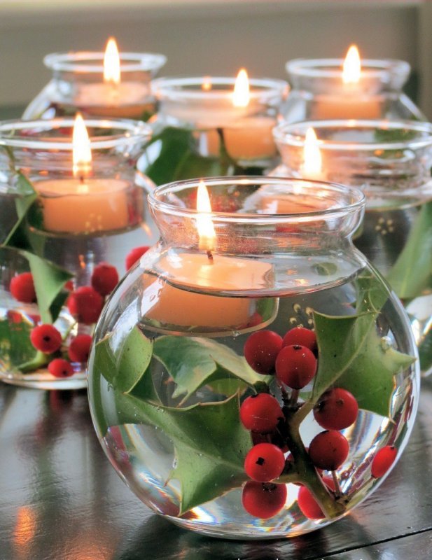 Плавающие свечи. Отличная идея – декорирование новогоднего стола вазой из прозрачного стекла с водой, с елочными шарами и плавающими свечками. По желанию, воду можно слегка подкрасить. Можно сделать так, как на фото, а можно и проявить креативность.