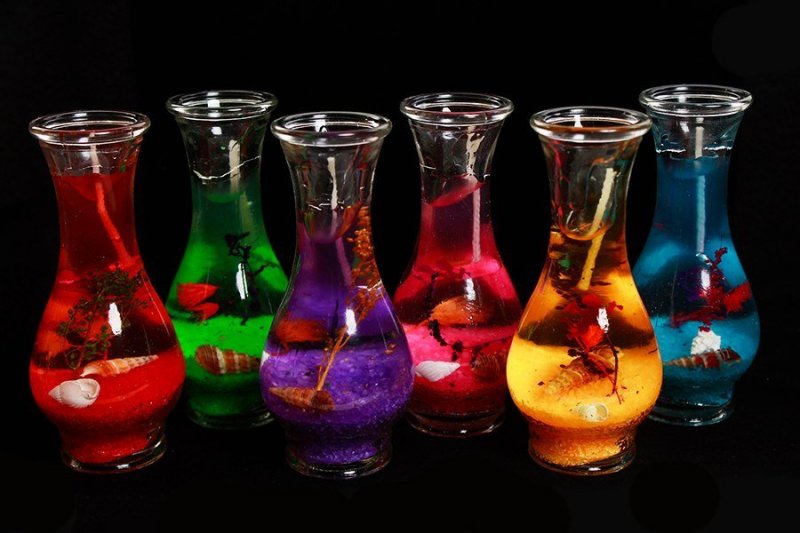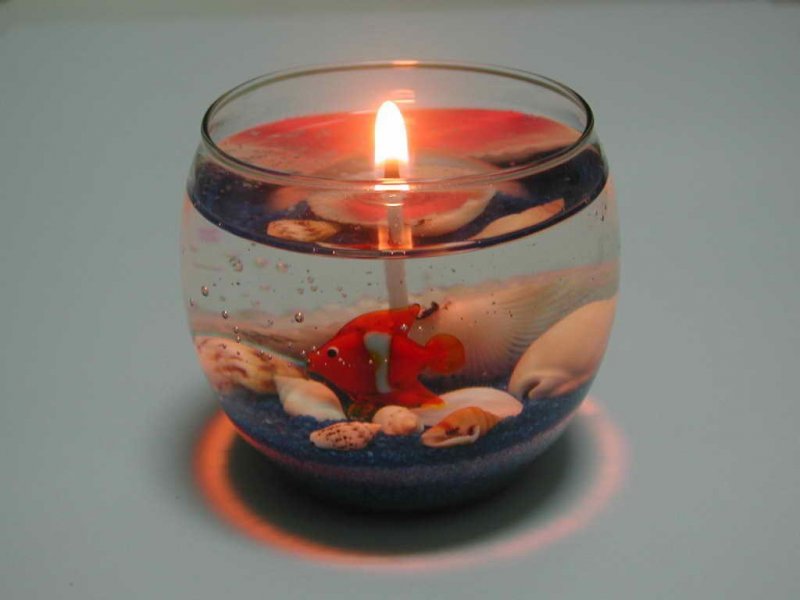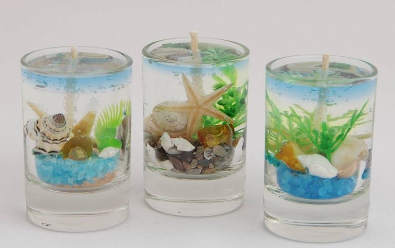 Эта разновидность – самая декоративная. Гелевую массу заливают в стеклянный сосуд, где, помимо фитиля, находятся декоративные предметы.