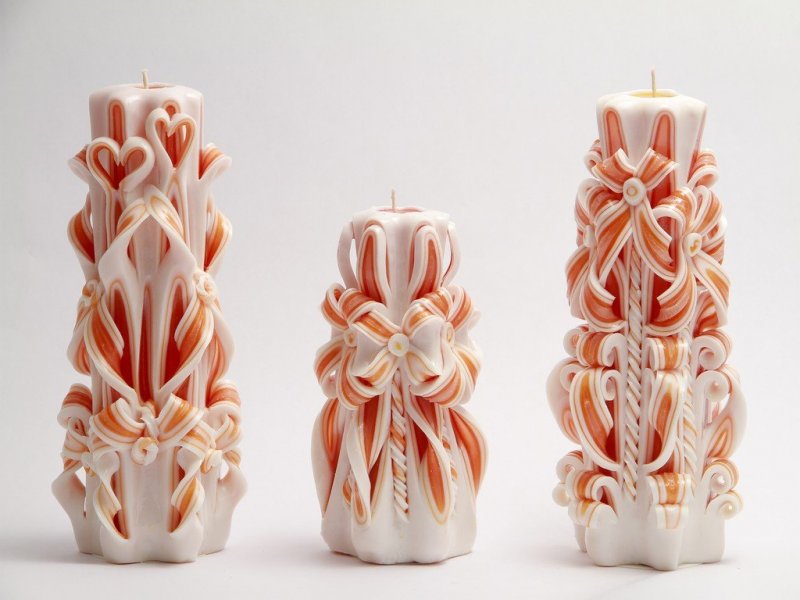 Это многоцветные, украшенные декором, резные изделия, а также свечи-статуэтки.
