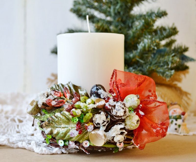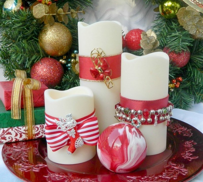 Красиво выполненные свечи с новогодними аксессуарами способны украсить любой интерьер, создать праздничную атмосферу. Обычная посуда из прозрачного стекла служит прекрасным и оригинальным подсвечником: