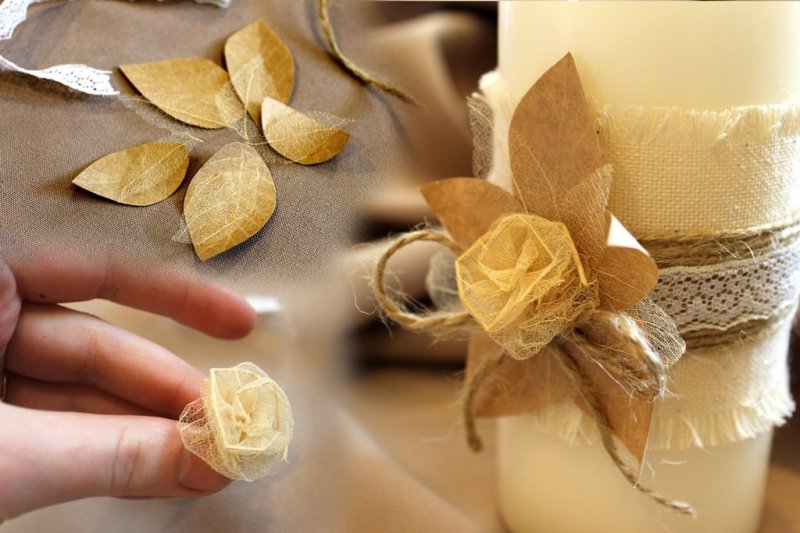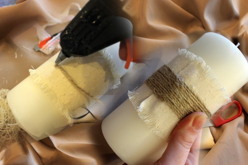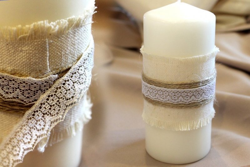 Вырежьте полоску из мешковины или текстиля шириной в 50-60 мм. Длина полосы соответствует обхвату свечи с поправкой на нахлест. Распустите ткань сверху и снизу так, чтобы получилась одинаковая бахрома. Если полоска получилась не совсем ровная, можно подровнять бахрому. Оберните полосу тканью. Приклейте в месте нахлеста шнур и намотайте его ровным слоем в 1,5-2 см посередине мешковины. Наклейте поверх джута тонкое кружево. Украшать композицию можно сухими листьями или листочками из упаковочной бумаги, искусственными цветами или бусинами. Красиво и необычно будет выглядеть живая орхидея. Главное, чтобы декора не было слишком много, иначе вся изысканная простота пропадет. Свечка «рустик-стиль» готова.