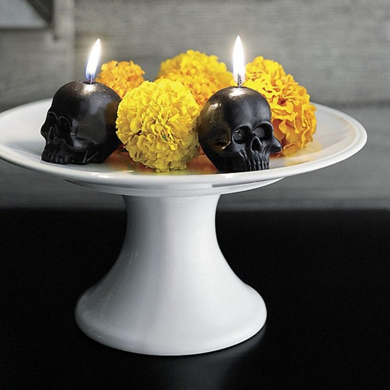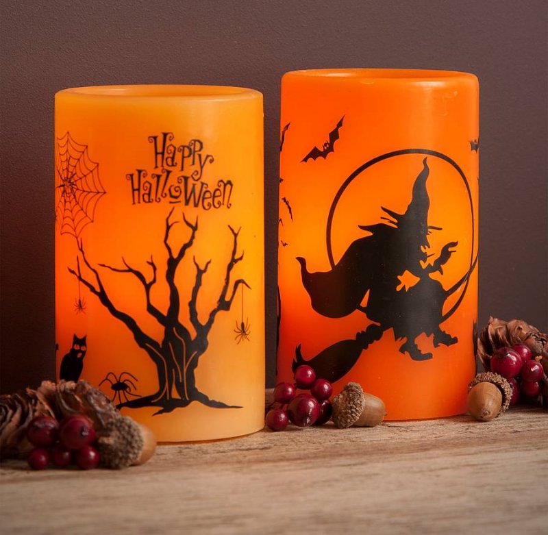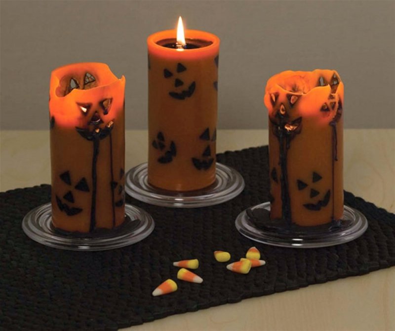 Непременными атрибутами праздника Хэллоуин являются яблоки и тыквы. Конечно, вставить свечу внутрь «выпотрошенной» тыквы можно, но это уже привычно до банальности. Гораздо интереснее смотрится новинка сезона — свечи, «плачущие кровавыми слезами». Делать их – проще простого! Накапайте на белые свечи окрашенный парафин с красных свечей или просто сбрызните их красной краской – готово! Неплохой вариант – украшения из искусственных пауков или червей (магазин рыболовных товаров – в помощь). Красиво смотрится украшение свечей декупажем с изображением скелетов, вампиров, оживших мертвецов, летучих мышей и прочих виновников праздника.