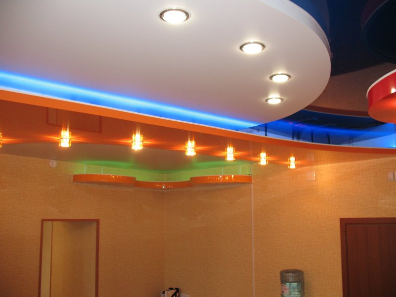 лампочки внутри – плоскость с подсветкой, располагающейся за потолками различного колера, создает зонирование пространства с помощью цвета, спокойное рассеянное освещение;