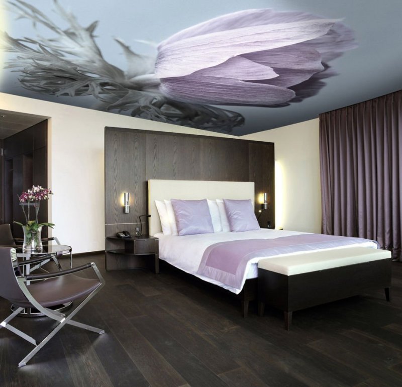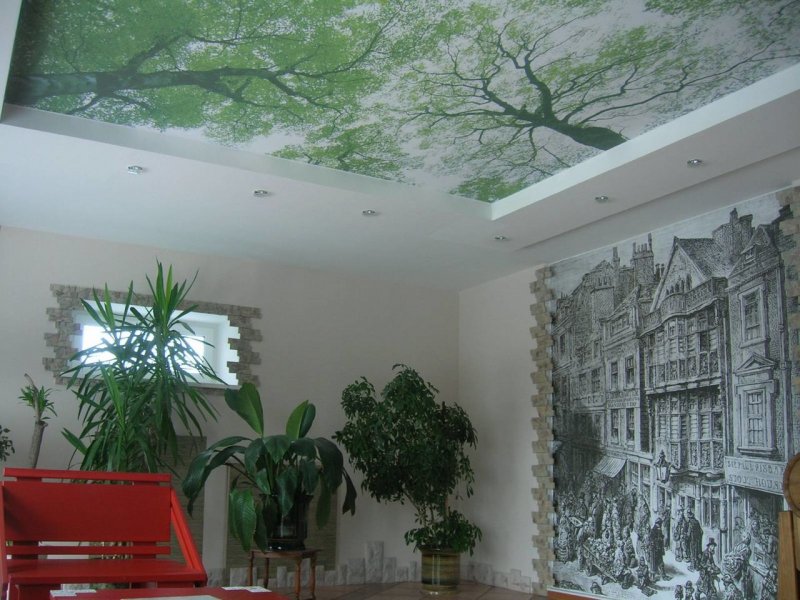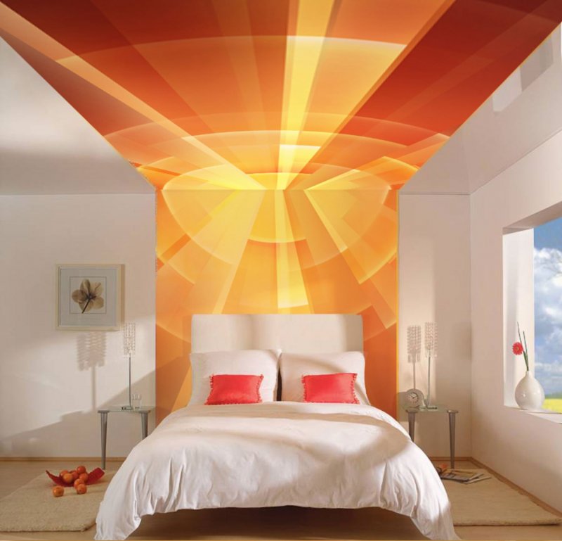 В разных комнатах используют различные мотивы: для кухни подойдут картинки с фруктами, кофейными зернышками, бабочками, листиками. Зал, спальню, прихожую украсят изображения пальм, сосен, будто смыкающих кроны над головой, симметричных либо спиральных орнаментов, абстракций. В ванной хорошо смотрятся плывущие дельфины, диковинные рыбы среди кораллов, имитация солнца, светящего сквозь толщу воды. Детская оформляется космическими сюжетами, нежными облачками, сюжетами из сказок, милыми зверушками.