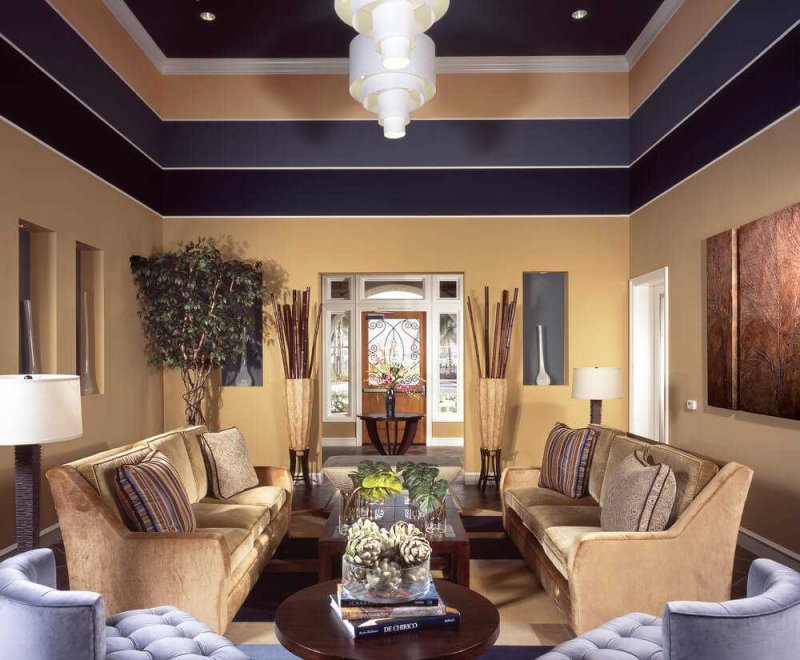 Чаще всего используются однотонные покрытия – их проще подобрать под определенный стиль интерьера. Обычно колер стен делается темнее потолка как минимум на два-три тона. Красиво смотрится сочетание бежевого с коричневыми стенами, голубого – с фиолетовыми, желтого – с красно-оранжевыми, алого – с белоснежными и др.