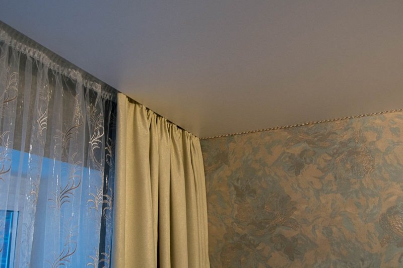 Скрытый – в этом случае карниз незаметен, он «прячется» в нише. Способ относительно сложный, но выглядит интереснее – занавески будто бы ниспадают из-за плоскости потолка. Карниз приобретается перед тем, как сняты мерки с потолка – размер карниза соответствует величине ниши, площади полотнища. Крепится карниз на перекрытия потолка – применяются дюбели, имеющие металлическую либо пластмассовую гильзу. В двух-четырех миллиметрах от карниза приделывается брус из древесины – туда позднее монтируется профиль, фиксирующий потолочное полотно. Прикрепляют его с той стороны, где карниз, чтобы пленка закрывала брусок целиком. Наилучшим образом такой вариант подходит для очень блестящего потолка.