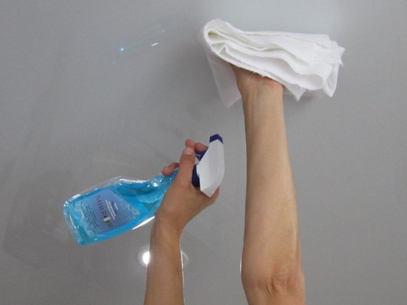 Глянцевую конструкцию обычно отмывают раствором жидкого мыла, специальными средствами. Для блеска потолок протирают девятипроцентным спиртовым раствором, используя максимально мягкую ткань. Любые абразивы, средства, содержащие ацетон, полностью недопустимы, сильно тереть также запрещается. Когда потолок закреплен непрочно, мощный пылесос также может нарушить его структуру. Матовые, сатиновые потолки прекрасно очищаются при помощи водяного пара, пароочистителя. Если предстоит мыть конструкцию губкой, воды используется по минимуму, иначе получатся некрасивые разводы.